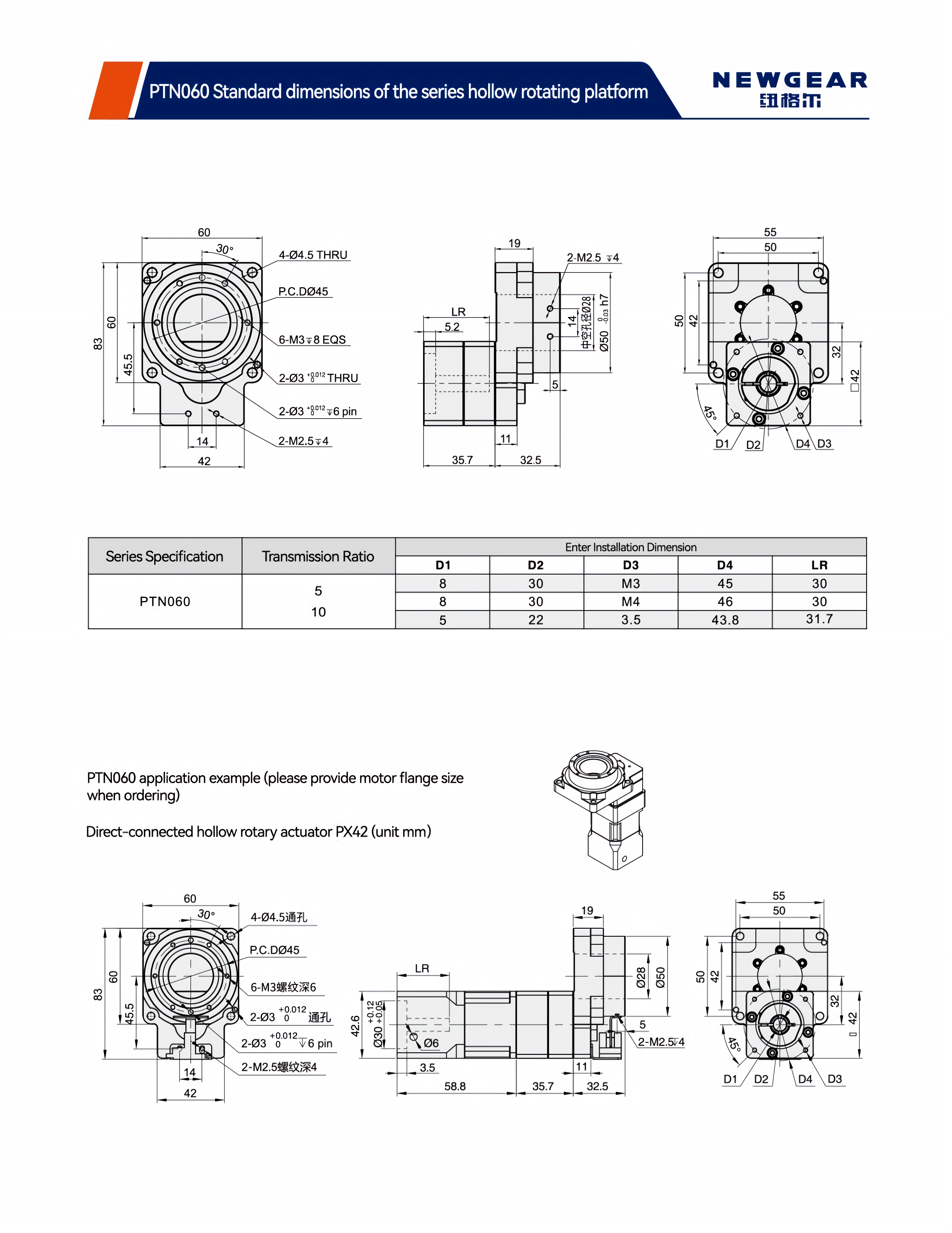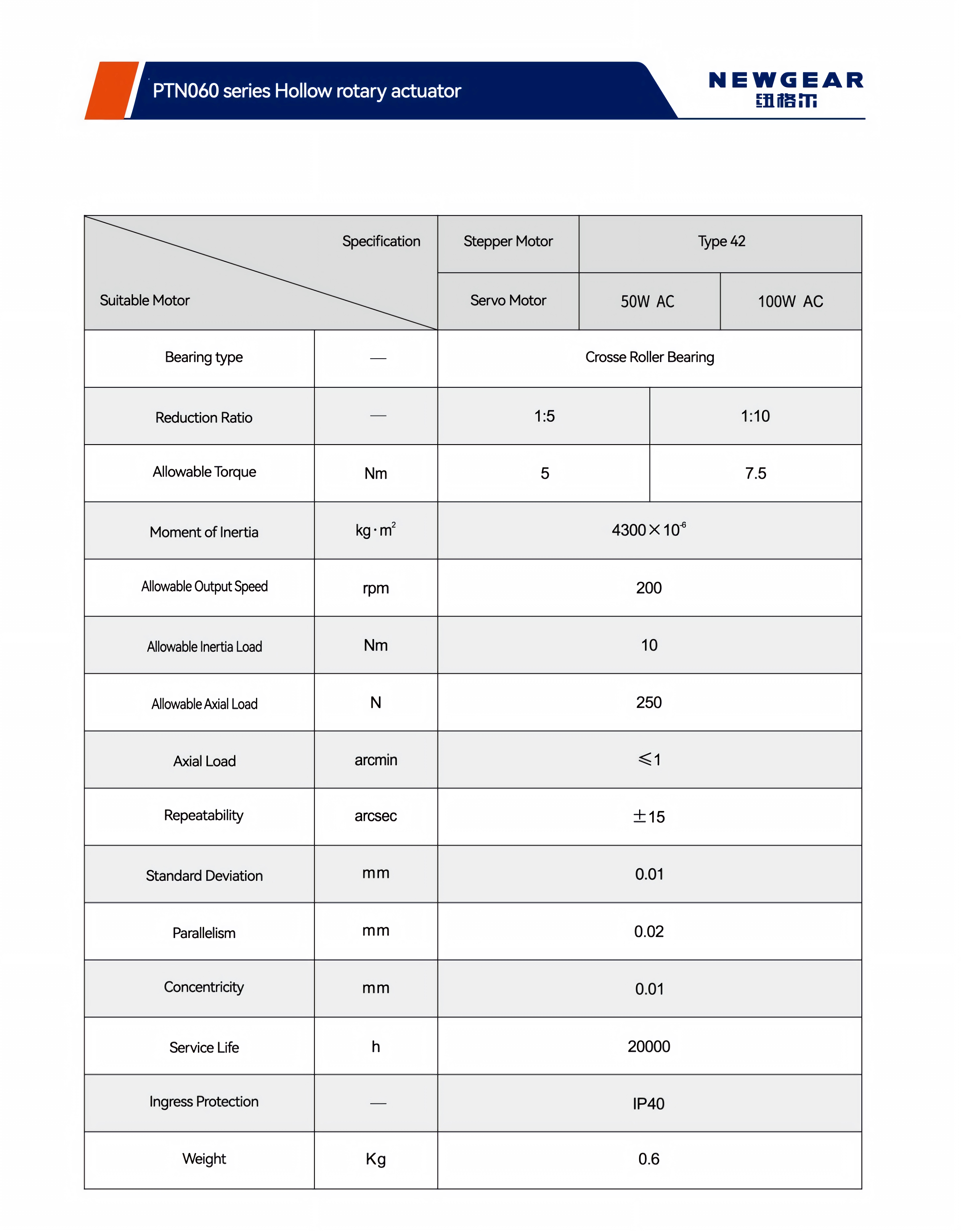 PTN060 — это экономичная модель из нашей серии полых поворотных столов, разработанная для автоматизированных приложений со средним и низким крутящим моментом. Она совместима с шаговыми двигателями NEMA 17 и серводвигателями переменного тока мощностью 50 Вт/100 Вт, предлагая передаточные числа 5:1 или 10:1. Люфт составляет ≤1 угловая минута, а повторяемость — ±15 угловых секунд, что обеспечивает точное индексирование и позиционирование. Унаследовав основные преимущества платформы, она включает в себя конструкцию с сквозными отверстиями и высокопрочные поперечные роликовые подшипники для удобства прокладки кабелей и надежной работы. Благодаря стандартной степени защиты IP40, она подходит для распространенных промышленных условий. Кроме того, она может быть легко объединена с нашими планетарными редукторами PX42 для расширения доступных диапазонов скорости и крутящего момента, обеспечивая компактное и эффективное поворотное решение для вашего оборудования.